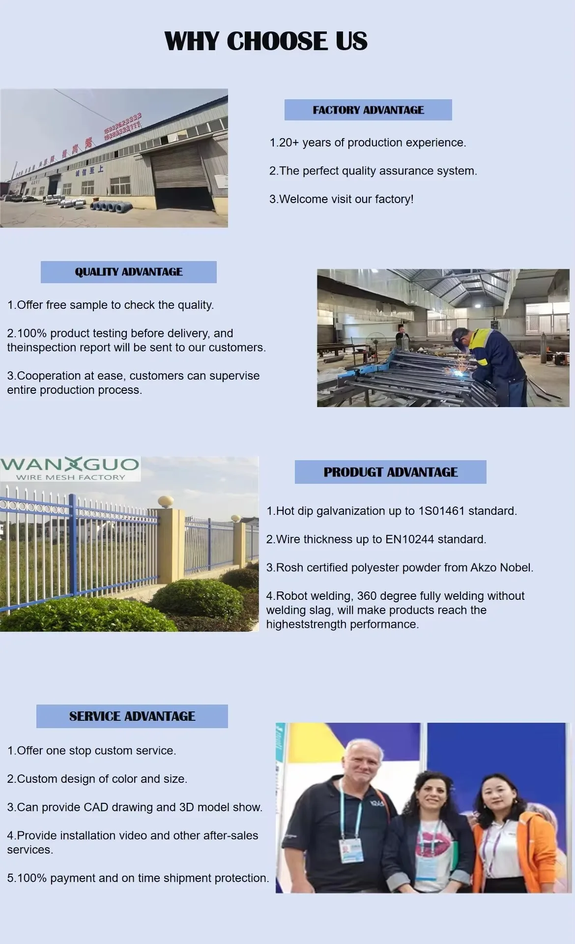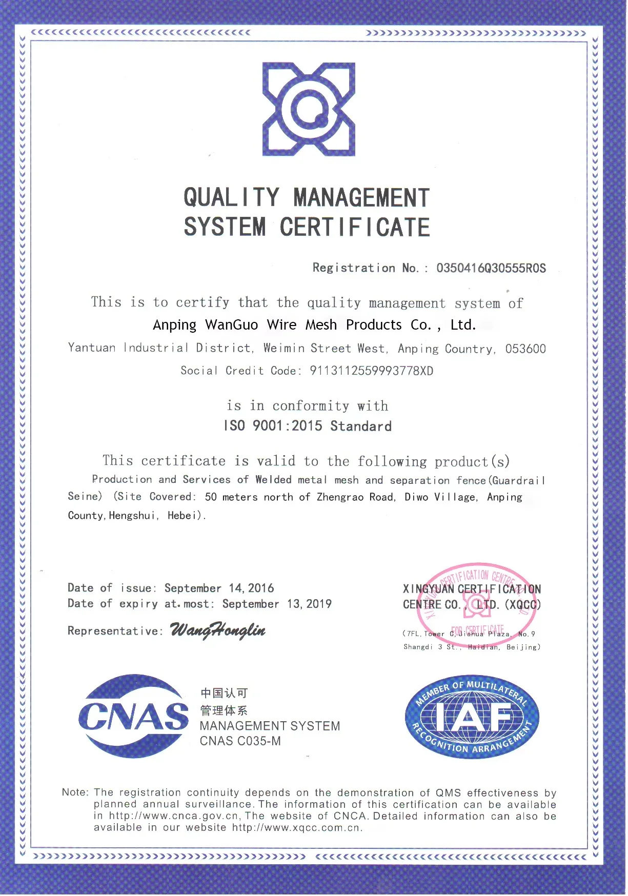 Anping Wanguo Wire Mesh Products Co., Ltd is located in the famous "Silk of Wire Mesh" wire mesh production base - Anping, Hebei, covering an area of Hengshui 2,600 square meters with a registered capital of 31 million yuan. Founded in 2012, specializes in the production of guardrails and steel gratings, and is designed and manufactured for the protection of opposite sex shields. We are adynamic, production-oriented company with development and innovation capabilities.