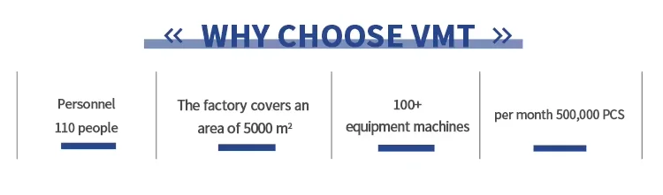 VMT has a 5,000-square-meter CNC machining plant with nearly 100 people. It has a standardized production workshop, CNC computer gongs, CNC lathes, milling machines, grinding machines, automatic tapping machines, wire cutting, EDM and other equipment. The average monthly production capacity is 300,000 pieces.