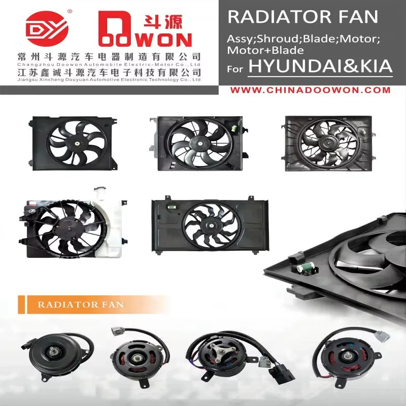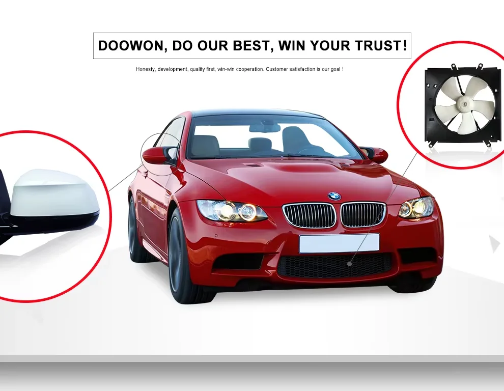 Changzhou Doowon Automobile Electric Motor Co., Ltd is a professional auto accessories producing and exporting company, integrating with science, industry and trade. Our company are dealing with hundreds of auto parts, all our products can be mainly classified four series: WOO brand series of cooling fan assembly series; Cooling fan motor series; Auto lamp, bumper, inner fender lining, grille, windshield washer pot and some other plastic parts series; Hood, fender, round girder, suspension and some other stamping parts series. Our products are mainly exported to the Southeast Asia, Africa, Middle East, South Korea etc. With several years of unremitting efforts, our company has become a certain modern enterprise in scale with advanced producing technology and high quality testing equipment. Our company bases on the principle of human-oriented, strive to cultivate and foster a batch of professional in management and technical producing, we adopt CAM and CAD system to design high-quality products for our clients. At present, our company is developing new products and moulds with higher technology. To meet our clients' needs, our products also can be made according to your samples or drawings. Our company will continue our business philosophy that detail determines success or failure. We're always trying our best to provide high-quality products at very competitive price and considerate service for all our customers. We welcome every old and new customers to contact us.We are based in Jiangsu, China, start from 2010,sell to North America(50.00%),Mid East(30.00%),Southeast Asia(10.00%),Africa(10.00%). There are total about 51-100 people in our office.