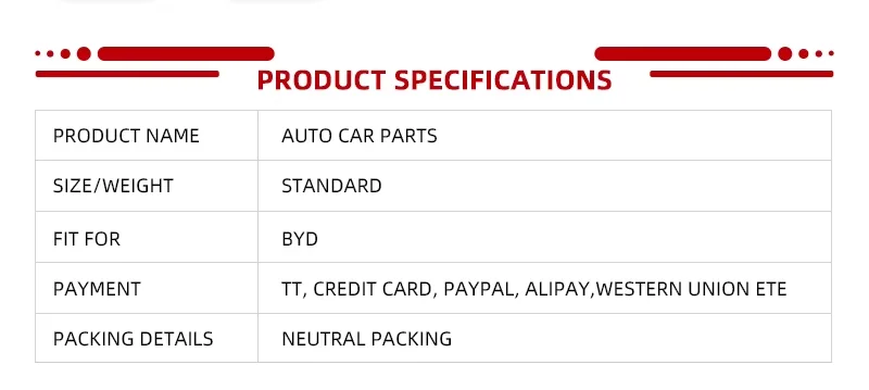 Car Model | BYD YUAN/BYD YUAN PRO/BYD S1 PRO/BYD YUAN PLUS/BYD ATTO 3/BYD SONG/BYD SONG PLUS/BYD QIN/BYD HAN/BYD TANG/ BYD SEAL/BYD DOLPHIN/ BYD SEAGULL/ BYD F0/ BYD F3/BYD F3R/ BYD F6/BYD S6/ BYD S7/BYD L3/BYD G3/BYD G3R/BYD e5/ BYD e6/ SURUI and etc. | |||