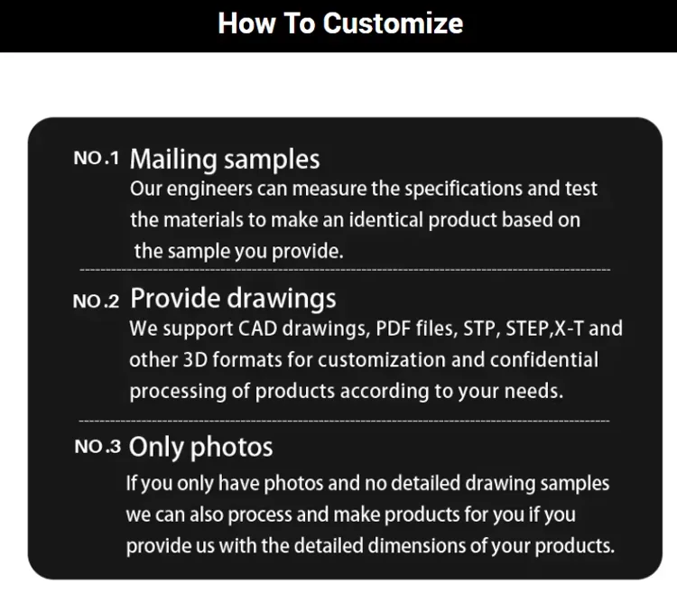 ●We can provide customization in different structure, size,logo and package so long as you provide design.We also can provide ODM service ●We can customize all kinds of Engineering plastics products according to customers’drawings or samples.