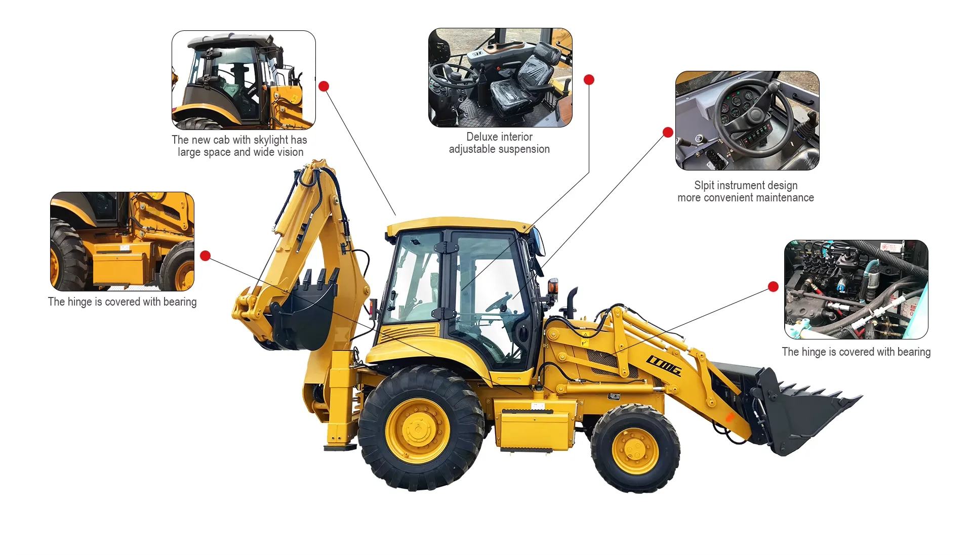 1. Humanization designs The hand handle layout reasonable, manipulating is portable; steer device, gauge dish and the chair all can be adjusted in up-down and front-back directions according to your sense. The back axle can swing up and down, it make wheels has well cling, so the machine has good span and cross capability. 2. Optimized load work device Reasonable joint layout,dependable position limit function. Levelling bucket automatically in unload position, alleviating labor intensity, and the work range is larger, workfore is more study and steady, the work efficiency is higher. 3. Optional parts: 4 in 1 bucket/ hammers/ Snow plough/ Augers