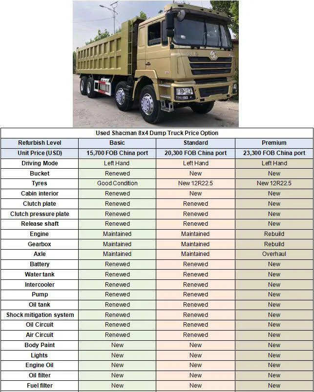 From the table, you can see, the basic level includes renewed cabin interior, tires, bucket, clutch plate, clutch pressure plate, release shaft, battery,water tank, intercooler, pump, oil tank. New body paint, light, engine oil and the filters. The main parts of the truck,such as engine, gearbox, axles are maintained.